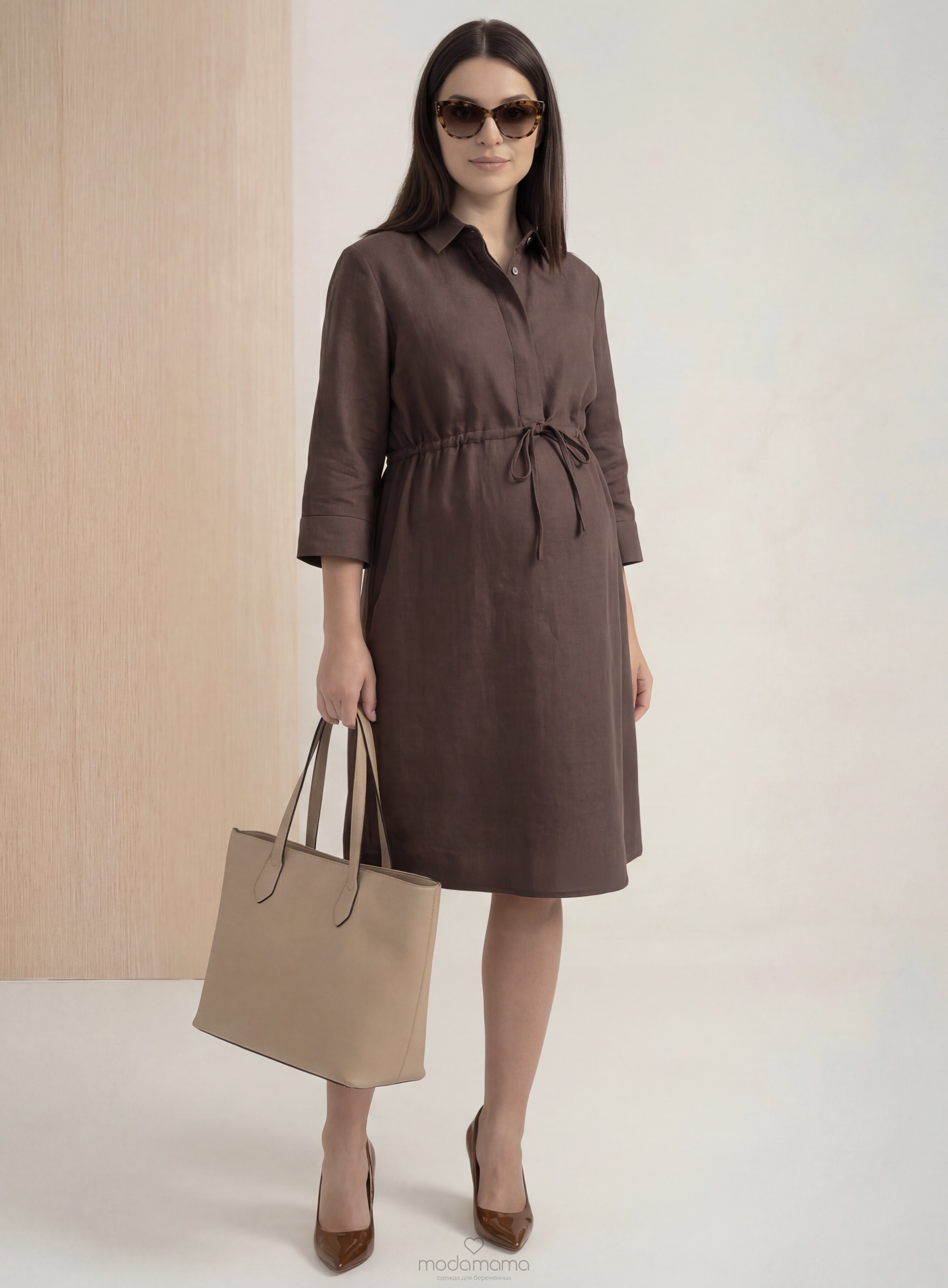 Платье для беременных и кормящих мам свободного кроя с завышенной талией. Объём под грудью регулируется кулиской со шнурком. Выполнено из лёгкой дышащей плательной ткани с льняным переплетением и лёгким эффектом жатости. Секрет для кормления- в планке на груди с потайными пуговицами.
